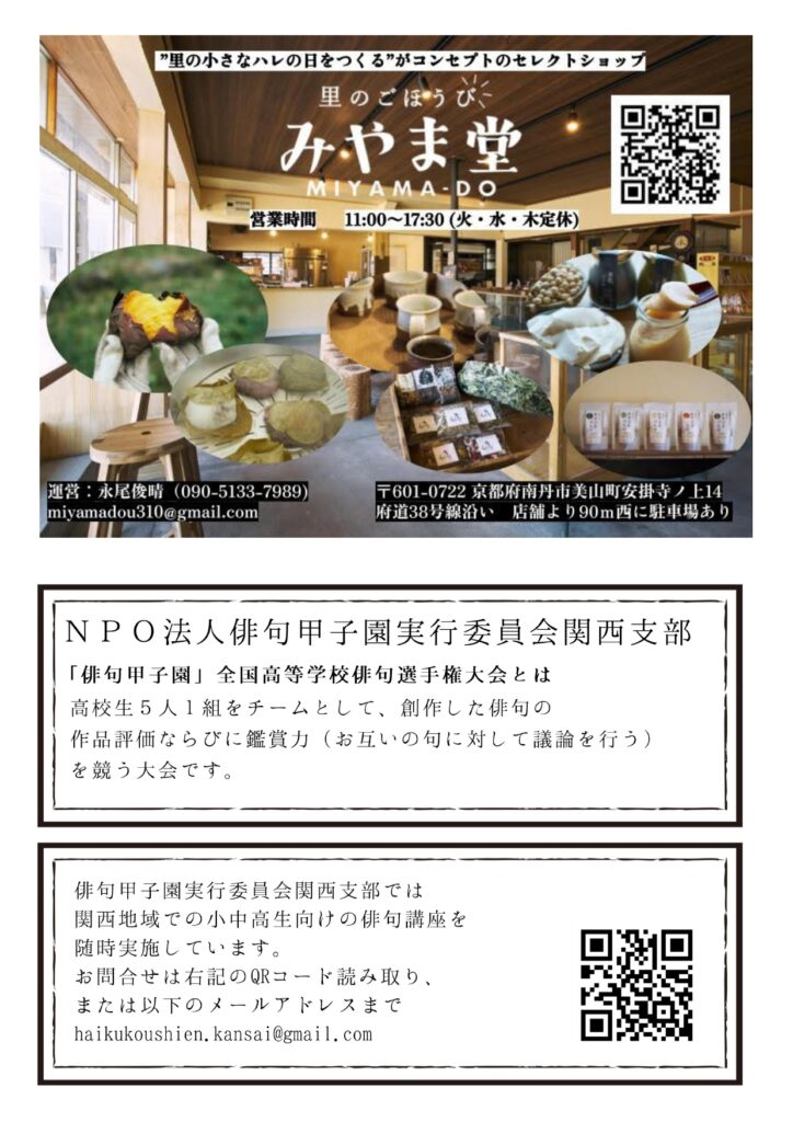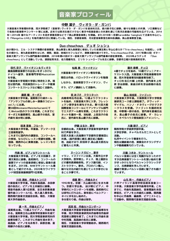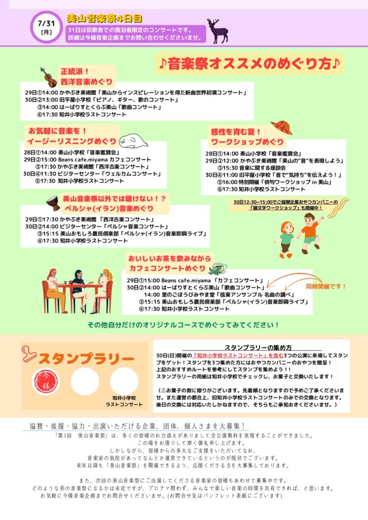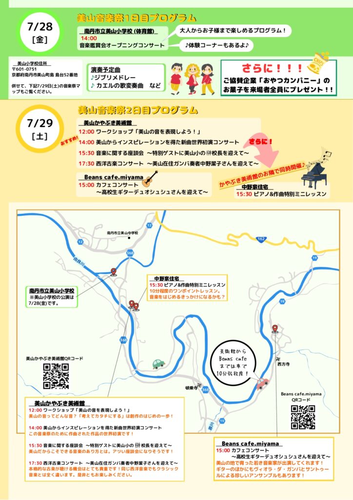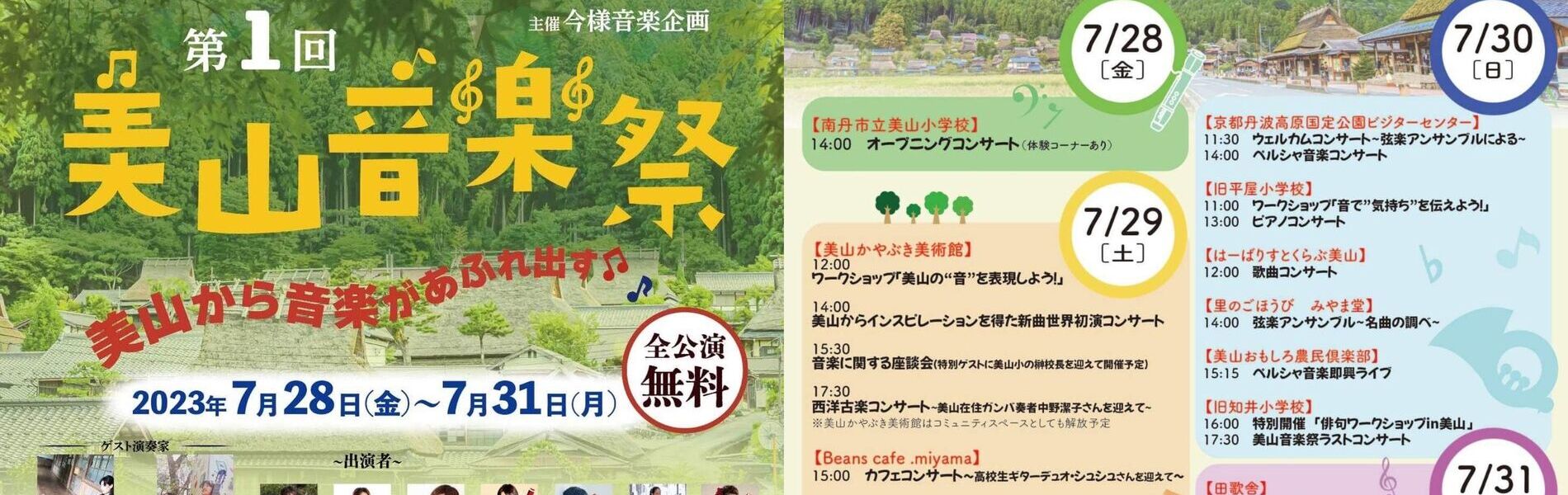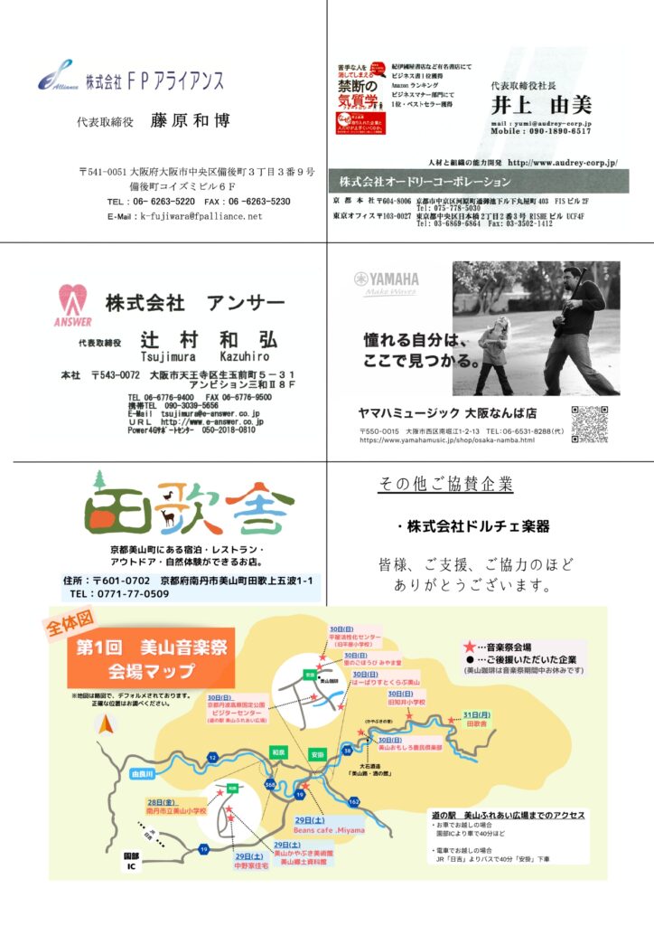 第1回 美山音楽祭 パンフレット 2023 7/22 concert event 美山音楽祭 2023年7月22日 美山音楽祭ページはこちら こちらが今回の音楽祭のパンフレットです! 音楽祭当日、会場にて無料で配布いたします。 concert event 美山音楽祭 URLをコピーしました! 美山音楽祭を開催致します! 美山音楽祭 スケジュール 関連記事 8/28 ホルンとピアノの演奏会 2025年7月22日 8/17 ヴァイオリン&サントゥールライブ 2025年7月22日 [報告]7/6『世界を旅する音楽会』in 綾部 2025年7月22日 第3回美山音楽祭へのご支援のお願い(広告ご支援および個人サポーター制度) 2025年6月27日 第3回美山音楽祭 募集開始! 2025年5月12日 第2回美山音楽祭各会場報告:9/16 旧知井小学校 2024年11月1日 第2回美山音楽祭各会場報告:9/15 美山かやぶき美術館 2024年11月1日 第2回美山音楽祭各会場報告:9/14美山珈琲 2024年11月1日