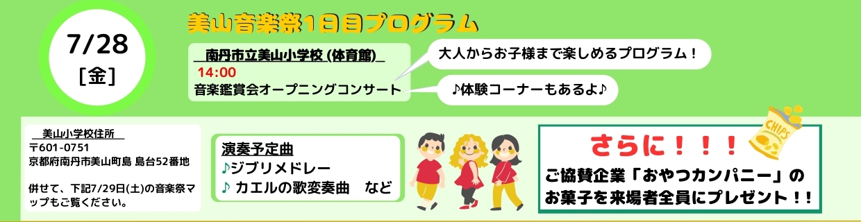 美山音楽祭 第1日(7/28) 2023 7/22 event 美山音楽祭 2023年7月22日 美山音楽祭ページはこちら 目次南丹市立美山小学校 14:00〜オープニングコンサート南丹市立美山小学校(MAP)体育館にて、この日限りのスペシャルな編成によるコンサートや、楽器・指揮の体験会など、 記念すべき第1回の開幕にふさわしい 盛りだくさんの企画を予定しております!ベビースターラーメン等でお馴染み、おやつカンパニー様のお菓子もプレゼントいたします。美山音楽祭を120%楽しむことができること間違いなし!ぜひ、お越しください。 event 美山音楽祭 URLをコピーしました! 美山音楽祭 スケジュール 美山音楽祭 第2日(7/29) 関連記事 8/28 ホルンとピアノの演奏会 2025年7月22日 8/17 ヴァイオリン&サントゥールライブ 2025年7月22日 [報告]7/6『世界を旅する音楽会』in 綾部 2025年7月22日 第3回美山音楽祭へのご支援のお願い(広告ご支援および個人サポーター制度) 2025年6月27日 第3回美山音楽祭 募集開始! 2025年5月12日 第2回美山音楽祭各会場報告:9/16 旧知井小学校 2024年11月1日 第2回美山音楽祭各会場報告:9/15 美山かやぶき美術館 2024年11月1日 第2回美山音楽祭各会場報告:9/14美山珈琲 2024年11月1日