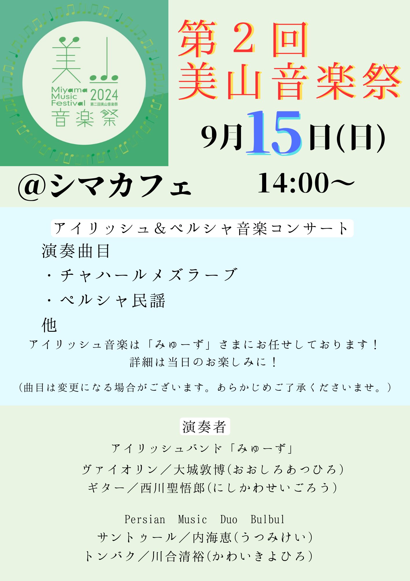 | 日時 | 2024年9月15日 14:00〜アイリッシュ&ペルシャ音楽コンサート |