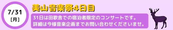 美山音楽祭の各会場・各イベントの詳細を、下の各リンク先にてご覧いただけます。 美山音楽祭ページはこちら第1日(7/28)第2日(7/29)第3日(7/30)第4日(7/31) -